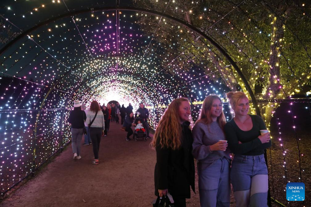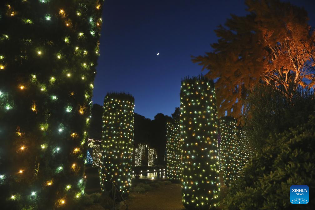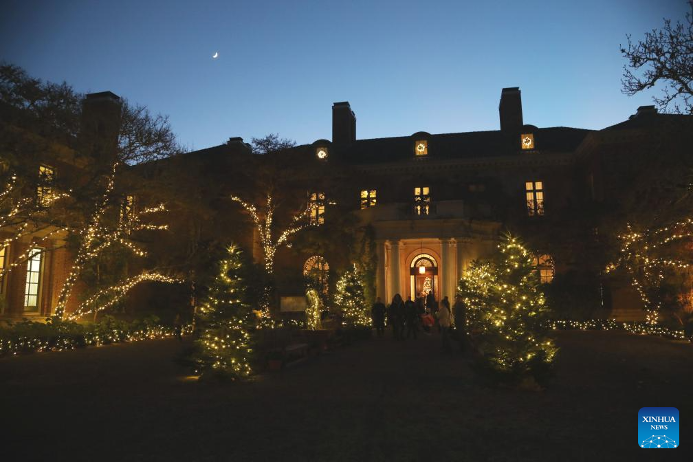 This photo taken on Dec. 16, 2023 shows light decorations at the Filoli Historic House & Garden in Woodside, California, the United States. Illuminated decorations have been assembled at the Filoli Historic House & Garden to attract visitors with Christmas and New Year approaching. (Photo by Liu Yilin/Xinhua)