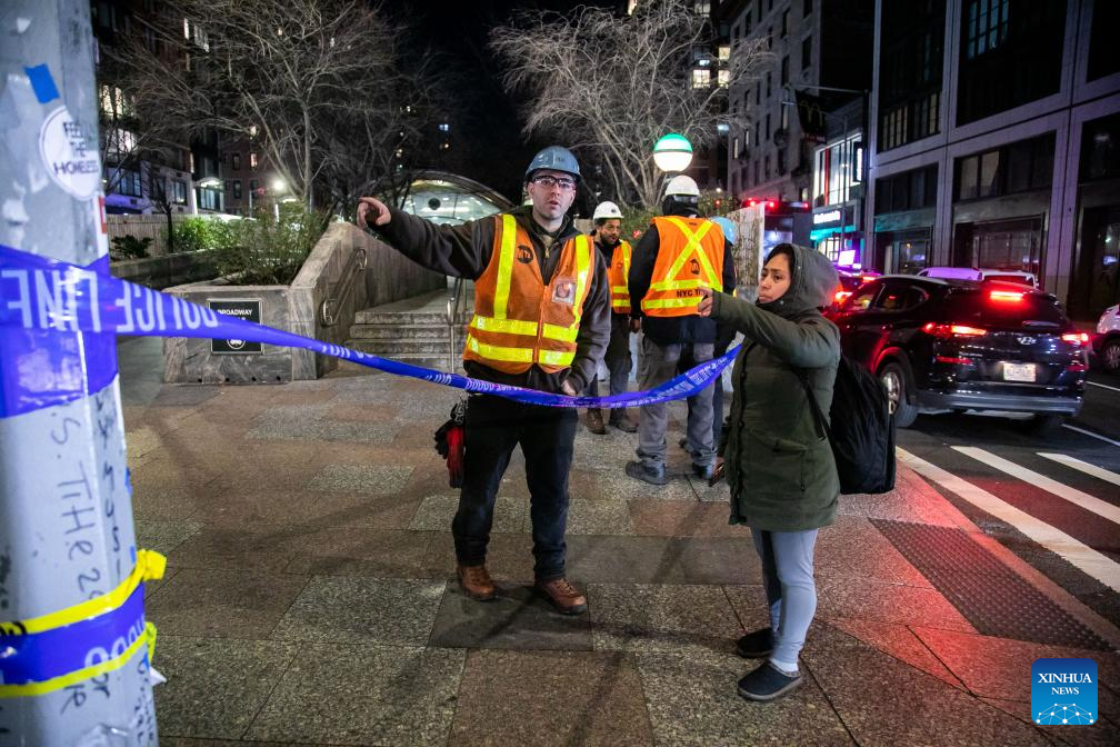 A police officer directs a woman to alternative public transit after a collision of two subway trains near the 96th Street Station in New York, the United States, Jan. 4, 2024. Two subway trains collided on the Upper West Side of New York City on Thursday afternoon, resulting in derailment of one train and multiple injuries. (Photo by Michael Nagle/Xinhua)