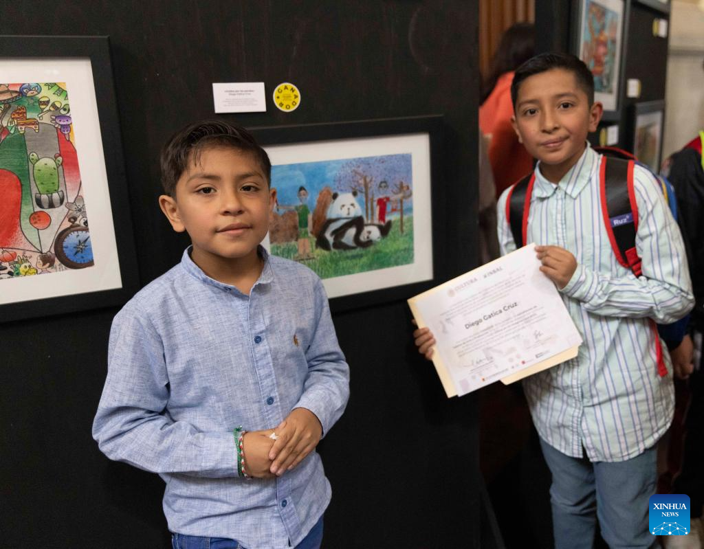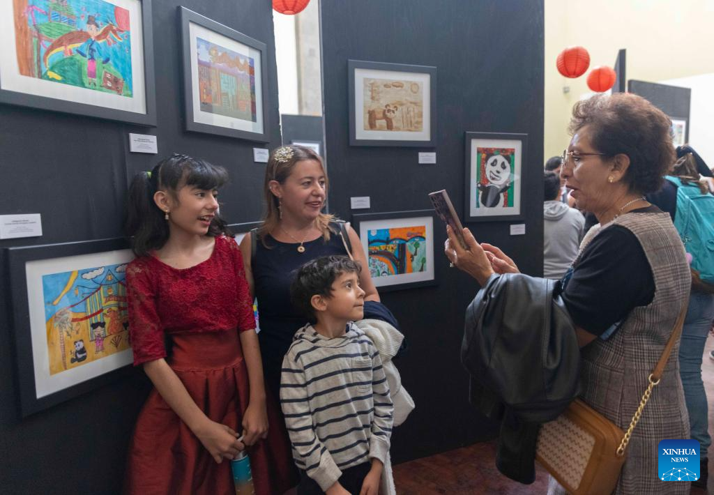 People pose for photos in front of paintings in Mexico City, Mexico, Jan. 10, 2024. The tenth "China in my imagination" children's painting contest held its awarding ceremony and the opening ceremony of an exhibition of the entries on Wednesday. (Xinhua/Li Mengxin)