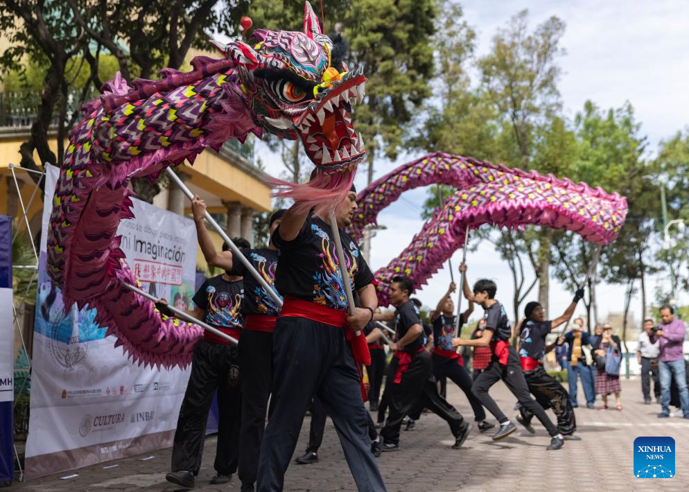 This photo taken on Jan. 10, 2024 shows a dragon dance performance in Mexico City, Mexico. The tenth "China in my imagination" children's painting contest held its awarding ceremony and the opening ceremony of an exhibition of the entries on Wednesday. (Xinhua/Li Mengxin)