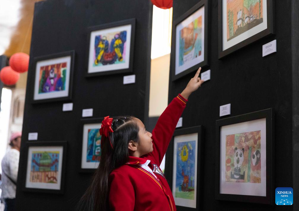 A girl points at a painting in Mexico City, Mexico, Jan. 10, 2024. The tenth "China in my imagination" children's painting contest held its awarding ceremony and the opening ceremony of an exhibition of the entries on Wednesday. (Xinhua/Li Mengxin)