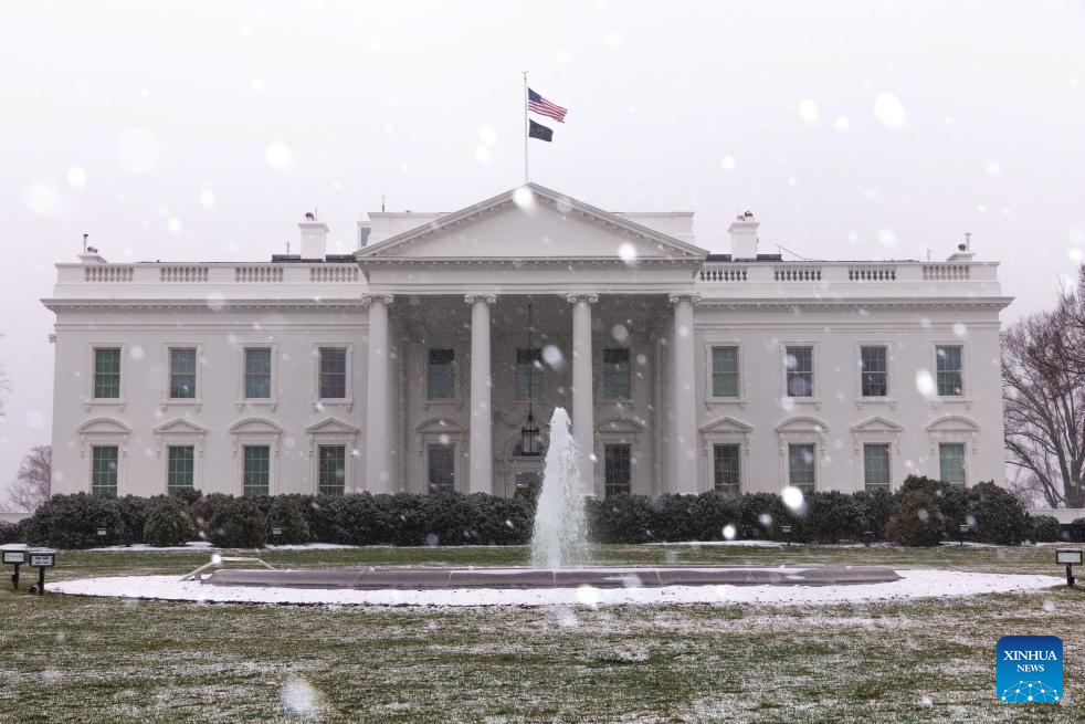 The White House is seen during a snowfall in Washington, D.C., the United States, Jan. 15, 2023. The Washington, D. C. and its surrounding areas greeted the first snowfall of 2024 on Monday, which led to the delay and cancellation of part flights, traffic accidents and suspension of school classes. (Photo by Aaron Schwartz/Xinhua)