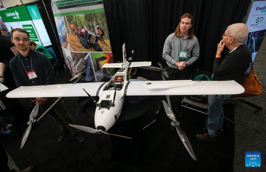 A drone specialized for mineral exploration is displayed at a trade show of the Association for Mineral Exploration's Roundup 2024 in Vancouver, British Columbia, Canada, on Jan. 22, 2024. The Association for Mineral Exploration's Roundup event kicked off on Monday featuring a four-day trade show with key players in mineral exploration, development, mining and reclamation from around the world. (Photo by Liang Sen/Xinhua)