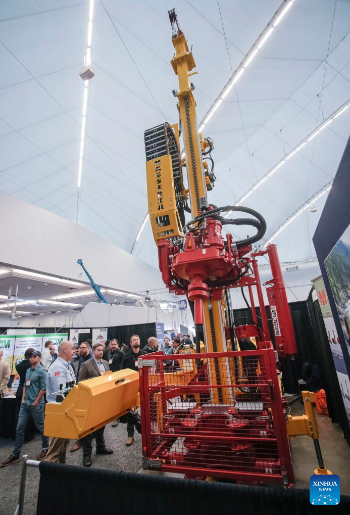 A drilling rig for mineral exploration is displayed at a trade show of the Association for Mineral Exploration's Roundup 2024 in Vancouver, British Columbia, Canada, on Jan. 22, 2024. The Association for Mineral Exploration's Roundup event kicked off on Monday featuring a four-day trade show with key players in mineral exploration, development, mining and reclamation from around the world. (Photo by Liang Sen/Xinhua)