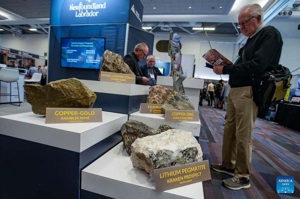 Mineral samples are displayed at a trade show of the Association for Mineral Exploration's Roundup 2024 in Vancouver, British Columbia, Canada, on Jan. 22, 2024. The Association for Mineral Exploration's Roundup event kicked off on Monday featuring a four-day trade show with key players in mineral exploration, development, mining and reclamation from around the world. (Photo by Liang Sen/Xinhua)