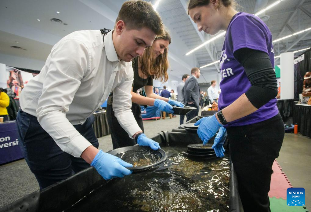 People try out the traditional gold panning at a trade show of the Association for Mineral Exploration's Roundup 2024 in Vancouver, British Columbia, Canada, on Jan. 22, 2024. The Association for Mineral Exploration's Roundup event kicked off on Monday featuring a four-day trade show with key players in mineral exploration, development, mining and reclamation from around the world. (Photo by Liang Sen/Xinhua)