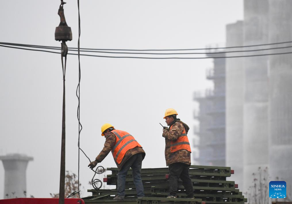 Workers of the China Railway Shanghai Bureau Group operate at the Fuping super major bridge of the Xi'an-Yan'an High-Speed Railway in Fuping County of Weinan City, northwest China's Shaanxi Province, Jan.18, 2024. Shaanxi Province has weathered several rounds of cold waves so far this winter, with temperatures plummeting to minus 26 degrees Celsius in Yan'an City, but constructors are still beating the adverse weather with normal operations at the construction site along the Xi'an-Yan'an High-Speed Railway.