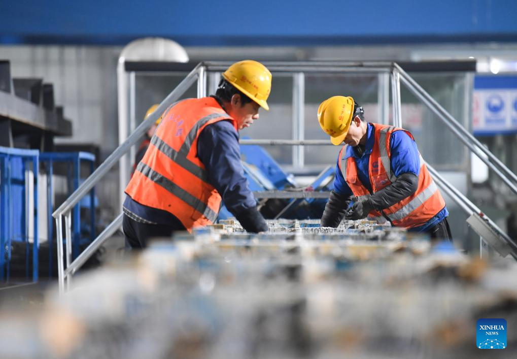Workers operate at a railway sleepers factory for the Xi'an-Yan'an High-Speed Railway in Tongchuan City, northwest China's Shaanxi Province, Jan.18, 2024. Shaanxi Province has weathered several rounds of cold waves so far this winter, with temperatures plummeting to minus 26 degrees Celsius in Yan'an City, but constructors are still beating the adverse weather with normal operations at the construction site along the Xi'an-Yan'an High-Speed Railway.
