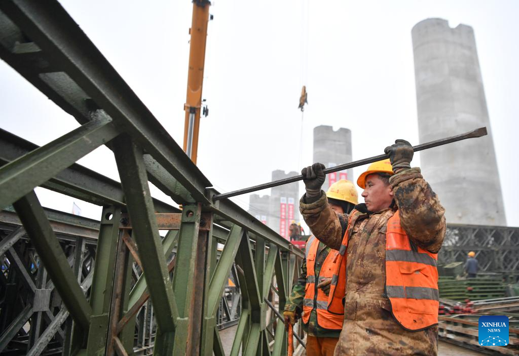 Workers of the China Railway 20th Bureau Group operate at the construction site of the Weihe River super major bridge of the Xi'an-Yan'an High-Speed Railway in Xi'an City, northwest China's Shaanxi Province, Jan. 25, 2024. Shaanxi Province has weathered several rounds of cold waves so far this winter, with temperatures plummeting to minus 26 degrees Celsius in Yan'an City, but constructors are still beating the adverse weather with normal operations at the construction site along the Xi'an-Yan'an High-Speed Railway.
