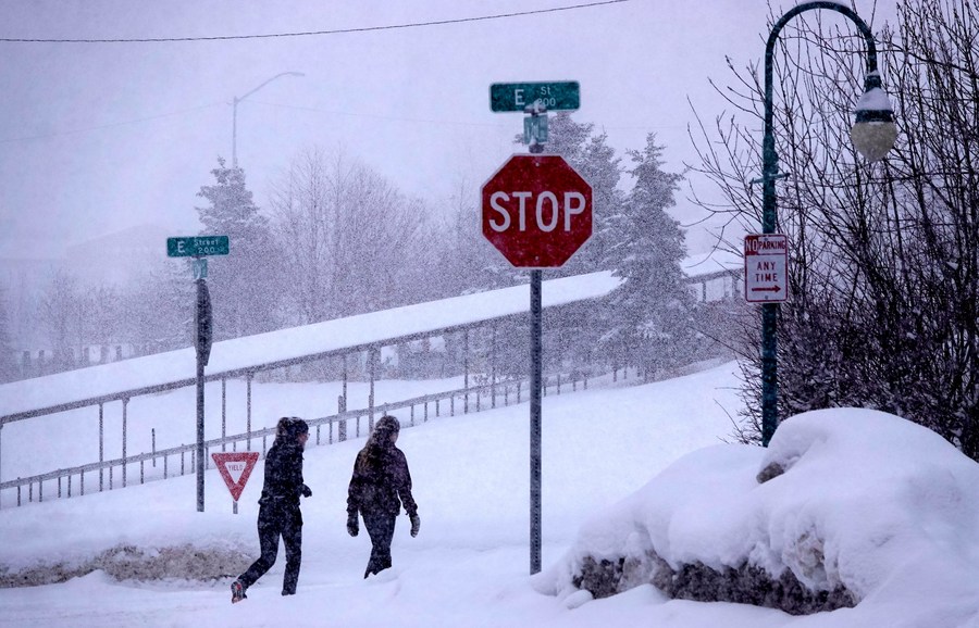 Photo taken on March 15, 2021 shows people walking in snow in Anchorage, Alaska, the United States. (Xinhua/Wu Xiaoling)