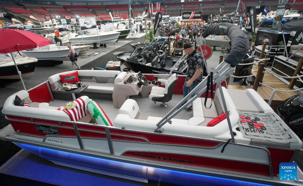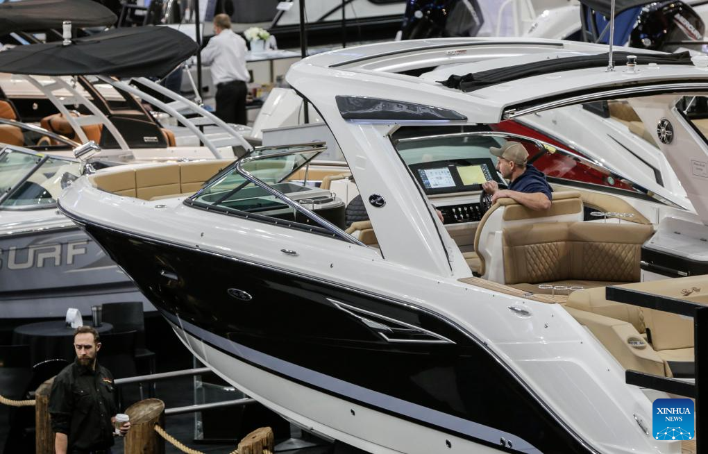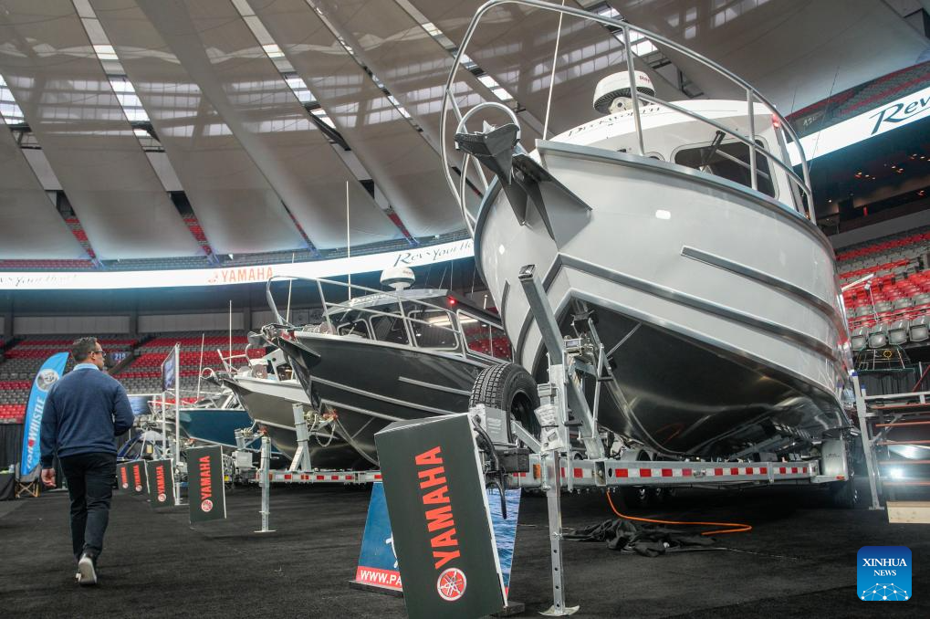 A man looks at a boat at the 2024 Vancouver International Boat Show in Vancouver, British Columbia, Canada, on Jan. 31, 2024. The Vancouver International Boat Show kicked off on Wednesday, featuring over 250 exhibitors from around the world and showcasing a wide selection of boats, accessories, and services. (Photo by Liang Sen/Xinhua)