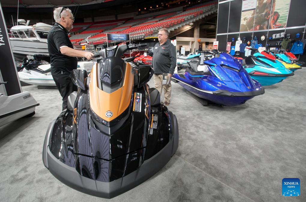 People look at a watercraft at the 2024 Vancouver International Boat Show in Vancouver, British Columbia, Canada, on Jan. 31, 2024. The Vancouver International Boat Show kicked off on Wednesday, featuring over 250 exhibitors from around the world and showcasing a wide selection of boats, accessories, and services. (Photo by Liang Sen/Xinhua)