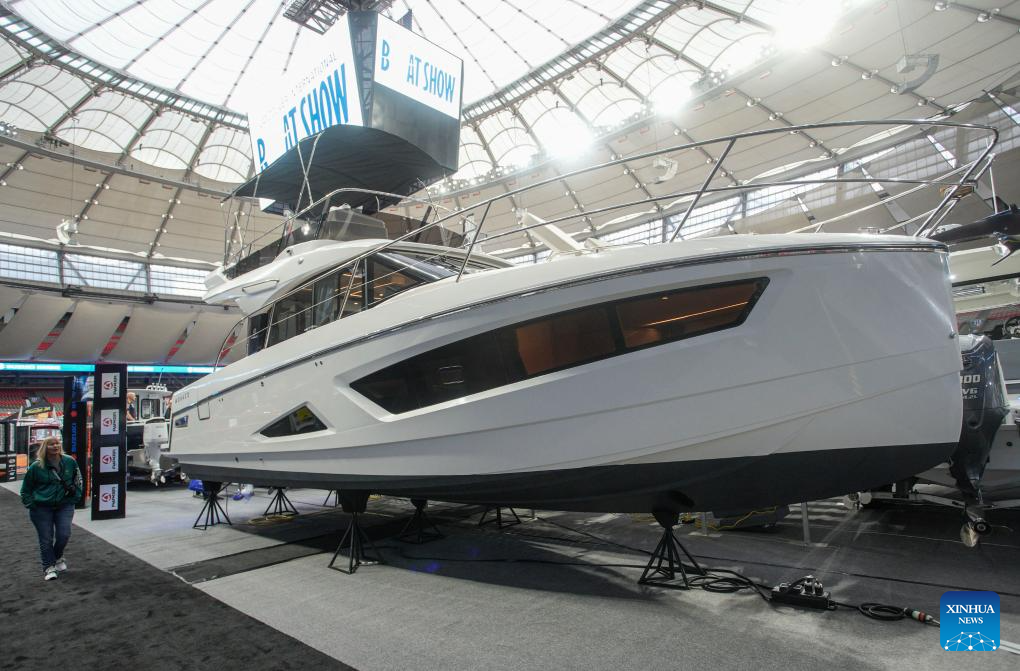 A yacht is displayed at the 2024 Vancouver International Boat Show in Vancouver, British Columbia, Canada, on Jan. 31, 2024. The Vancouver International Boat Show kicked off on Wednesday, featuring over 250 exhibitors from around the world and showcasing a wide selection of boats, accessories, and services. (Photo by Liang Sen/Xinhua)