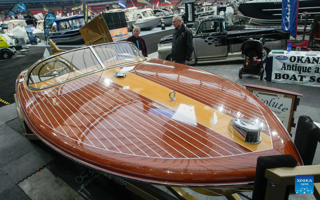 People look at a vintage boat at the 2024 Vancouver International Boat Show in Vancouver, British Columbia, Canada, on Jan. 31, 2024. The Vancouver International Boat Show kicked off on Wednesday, featuring over 250 exhibitors from around the world and showcasing a wide selection of boats, accessories, and services. (Photo by Liang Sen/Xinhua)