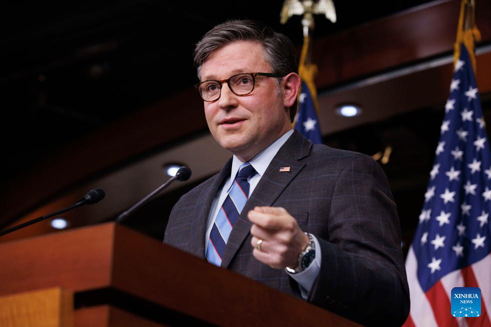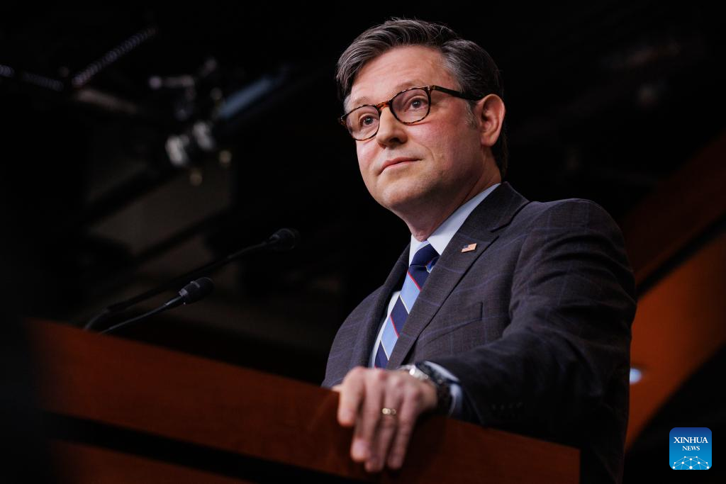 U.S. House Speaker Mike Johnson speaks during a press conference in the Capitol Building before an impeachment vote against Homeland Security Secretary Alejandro Mayorkas, in Washington, D.C., the United States, Feb. 6, 2024. In a major blow to the Republicans, U.S. Homeland Security Secretary Alejandro Mayorkas on Tuesday survived an impeachment vote over the border security issue in the House of Representatives. (Photo by Aaron Schwartz/Xinhua)