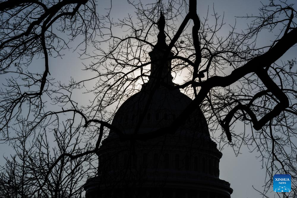 The silhouette of the U.S. Capitol building is seen in Washington, D.C., the United States, Feb. 6, 2024. In a major blow to the Republicans, U.S. Homeland Security Secretary Alejandro Mayorkas on Tuesday survived an impeachment vote over the border security issue in the House of Representatives. (Photo by Aaron Schwartz/Xinhua)