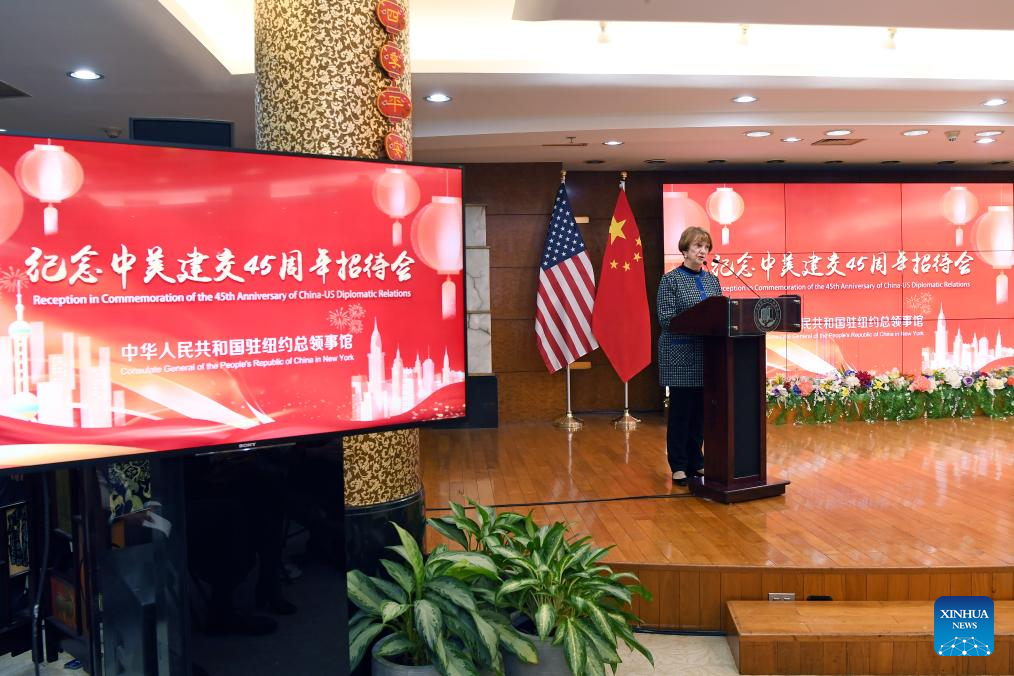 Susan Elliott, president and CEO of the National Committee on American Foreign Policy, speaks at a reception commemorating the 45th anniversary of China-U.S. diplomatic relations at the Chinese Consulate General in New York, on Jan. 17, 2024. Courage and strength, as exemplified by the Year of the Dragon, are much needed to further improve U.S.-China ties, the world's most important bilateral relationship, U.S. experts have said. (Xinhua/Li Rui)