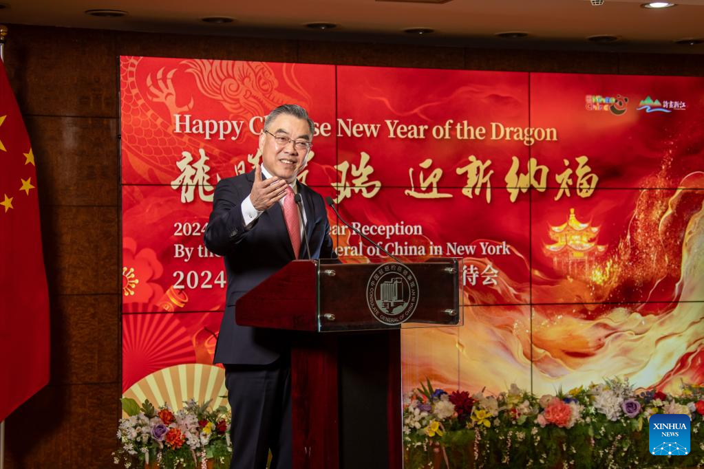 Chinese Consul General in New York Huang Ping speaks at a reception in celebration of the Year of the Dragon at the Chinese Consulate General in New York, on Feb. 5, 2024. Courage and strength, as exemplified by the Year of the Dragon, are much needed to further improve U.S.-China ties, the world's most important bilateral relationship, U.S. experts have said. (Photo by Winston Zhou/Xinhua)