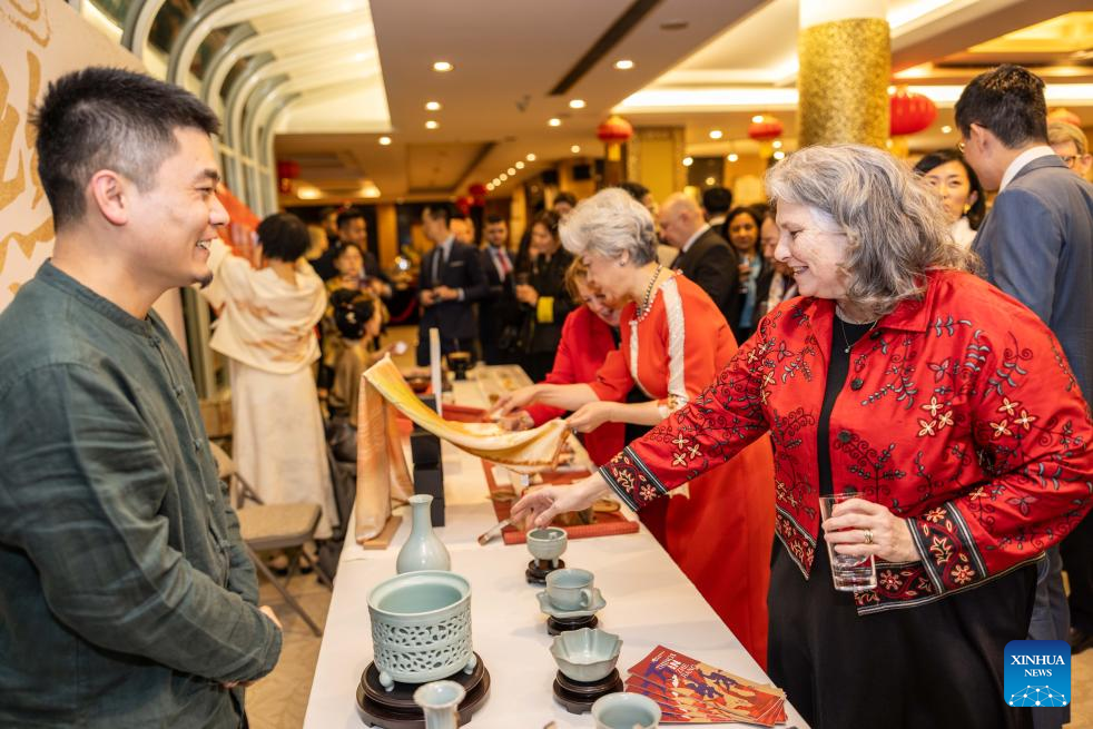 A guest talks to an artisan who showcases China's porcelain artifacts at a reception in celebration of the Year of the Dragon at the Chinese Consulate General in New York, on Feb. 5, 2024. Courage and strength, as exemplified by the Year of the Dragon, are much needed to further improve U.S.-China ties, the world's most important bilateral relationship, U.S. experts have said. (Photo by Winston Zhou/Xinhua)