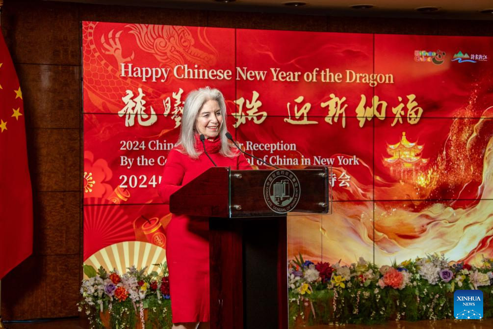 Jan Berris, vice president of the National Committee on U.S.-China Relations, speaks at a reception in celebration of the Year of the Dragon at the Chinese Consulate General in New York, on Feb. 5, 2024. Courage and strength, as exemplified by the Year of the Dragon, are much needed to further improve U.S.-China ties, the world's most important bilateral relationship, U.S. experts have said. (Photo by Winston Zhou/Xinhua)