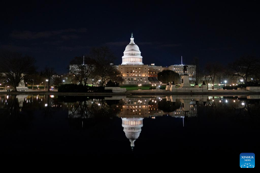 This photo taken on Feb. 13, 2024 shows a reflection of U.S. Capitol building in Washington, D.C., the United States. One week after a failed impeachment vote, the Republican-held U.S. House of Representatives on Tuesday voted to impeach Homeland Security Secretary Alejandro Mayorkas, making him the first cabinet member to be impeached in nearly 150 years. (Xinhua/Liu Jie)