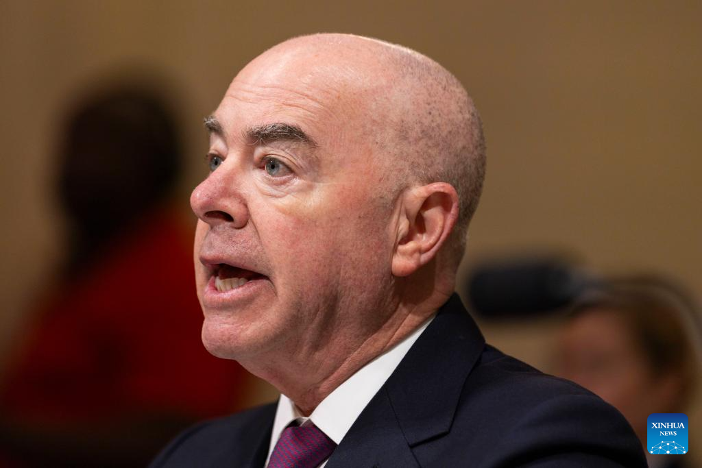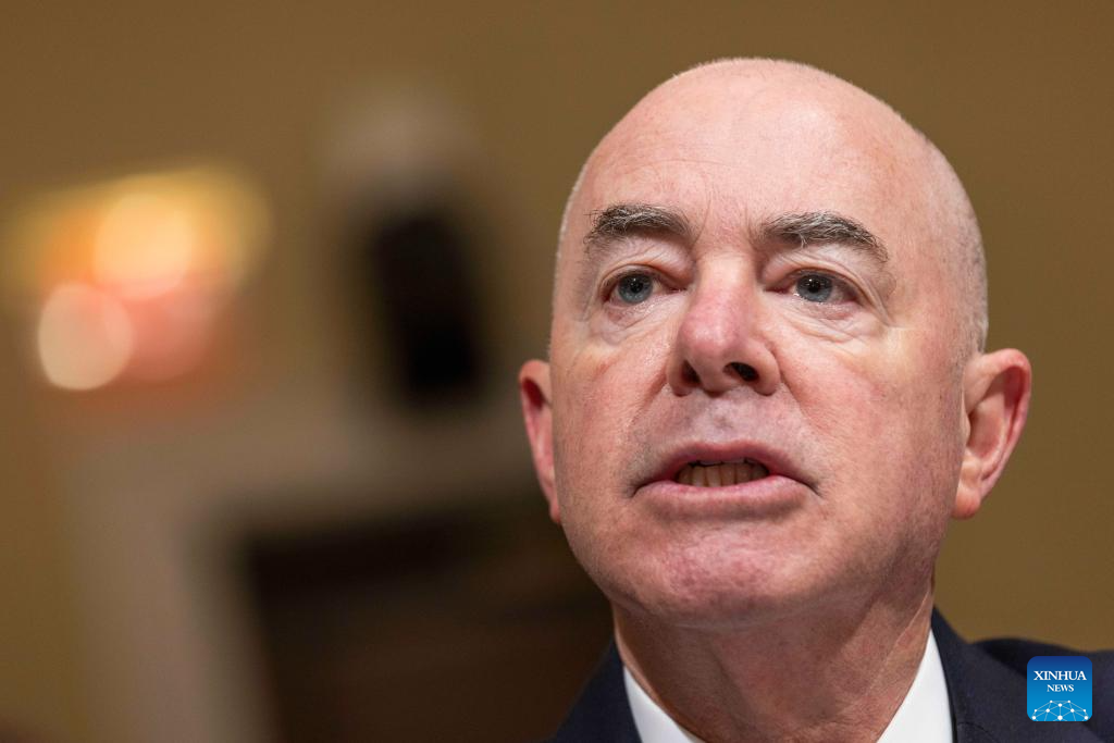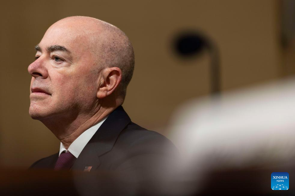 This file photo taken on Nov. 15, 2023 shows U.S. Homeland Security Secretary Alejandro Mayorkas testifying before the House Committee on Homeland Security during a hearing in Washington, D.C., the United States. One week after a failed impeachment vote, the Republican-held U.S. House of Representatives on Tuesday voted to impeach Homeland Security Secretary Alejandro Mayorkas, making him the first cabinet member to be impeached in nearly 150 years. (Photo by Aaron Schwartz/Xinhua)