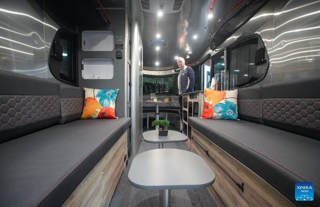 People visit a travel trailer at the Earlybird RV Show and Sale in Abbotsford, British Columbia, Canada, on Feb. 22, 2024. Featuring over 200 recreational vehicles from 45 exhibitors in North America, the Earlybird RV Show and Sale runs from Feb. 22 to Feb. 25. (Photo by Liang Sen/Xinhua)