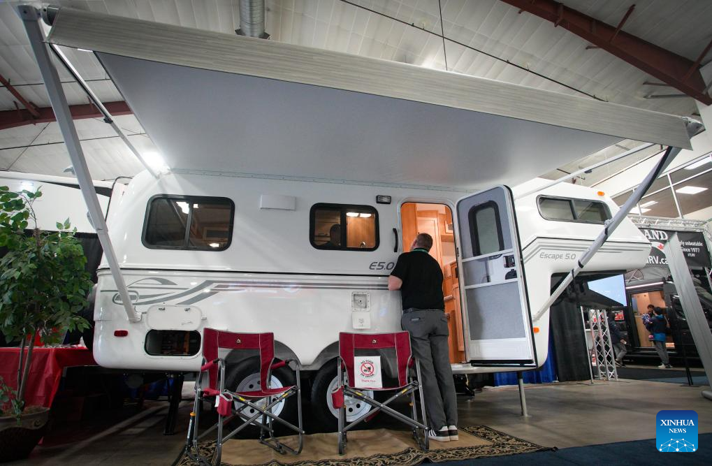 A man visits a recreational vehicle at the Earlybird RV Show and Sale in Abbotsford, British Columbia, Canada, on Feb. 22, 2024. Featuring over 200 recreational vehicles from 45 exhibitors in North America, the Earlybird RV Show and Sale runs from Feb. 22 to Feb. 25. (Photo by Liang Sen/Xinhua)