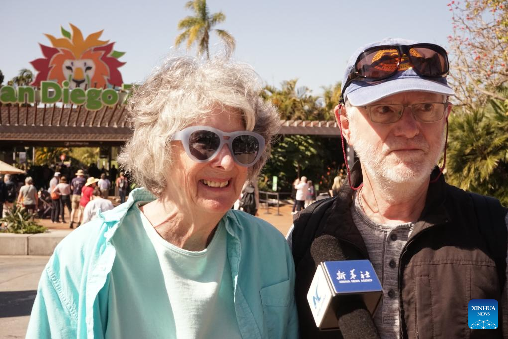 Visitors Lillian Hallberg (L) and George Hallberg are interviewed with Xinhua regarding China-U.S. giant panda conservation cooperation at the San Diego Zoo in San Diego, California, the United States, on Feb. 22, 2024. Panda lovers in the United States received a long-waited injection of hope after Chinese and U.S. wildlife conservation organizations signed a new round of agreement on giant panda conservation this week. (Photo by Zeng Hui/Xinhua)