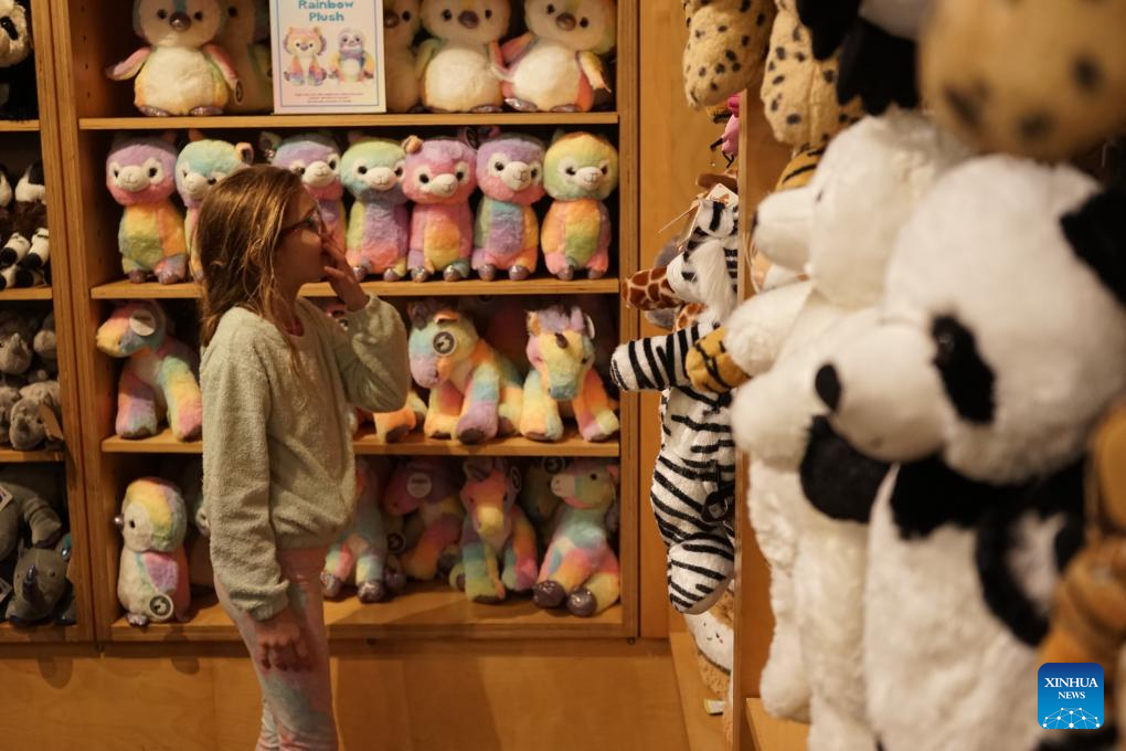 A girl visits a gift shop with giant panda-themed plushies at the San Diego Zoo in San Diego, California, the United States, on Feb. 22, 2024. Panda lovers in the United States received a long-waited injection of hope after Chinese and U.S. wildlife conservation organizations signed a new round of agreement on giant panda conservation this week. (Photo by Zeng Hui/Xinhua)