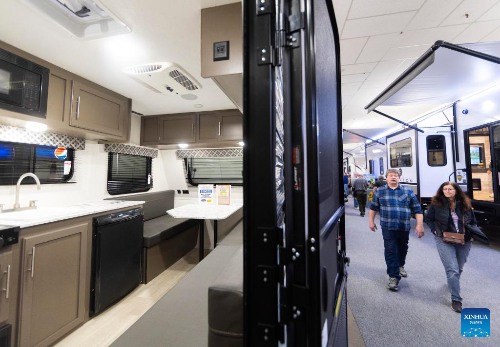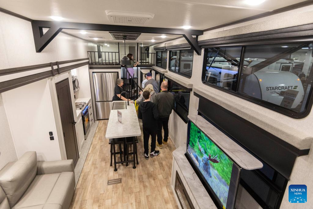 People tour a large travel trailer during the 2024 Toronto Spring Camping & RV Show in Mississauga, the Greater Toronto Area, Canada, on March 2, 2024. (Photo by Zou Zheng/Xinhua)