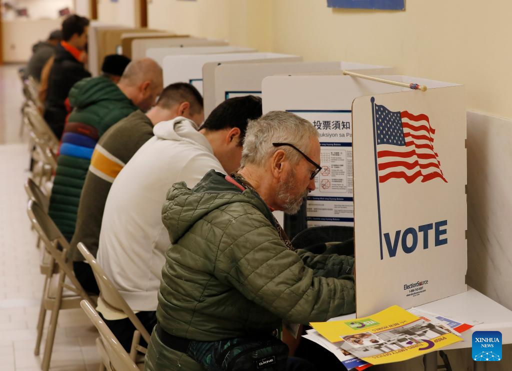 Voters cast ballots at a voting center in Los Angeles County, California, the United States, on March 5, 2024. Polls begin to open in more than a dozen U.S. states on the so-called "Super Tuesday" as part of the 2024 presidential primaries, with voters concerned about the leading candidates of both parties. (Xinhua)