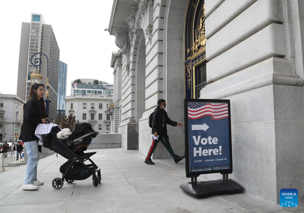 Citizens walk past a direction sign for voters outside the San Francisco City Hall in San Francisco, California, the United States, March 5, 2024. Polls begin to open in more than a dozen U.S. states on the so-called "Super Tuesday" as part of the 2024 presidential primaries, with voters concerned about the leading candidates of both parties. (Photo by Liu Yilin/Xinhua)