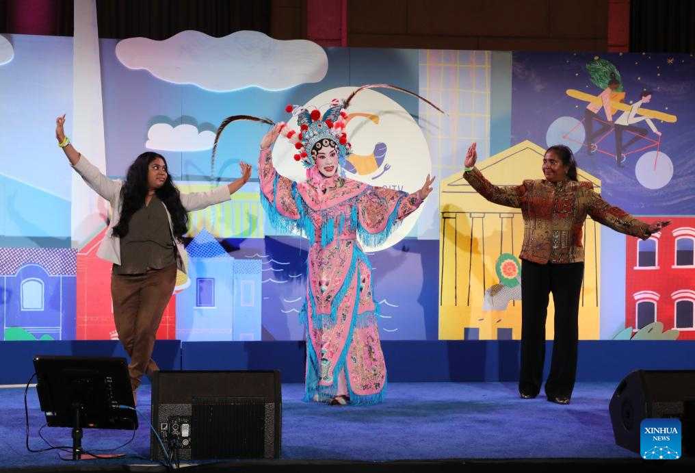 Visitors learn Chinese Peking Opera with an actress during the Events DC Embassy Chef Challenge in Washington, D.C., the United States, on March 7, 2024. More than 20 embassies competed in this year's Events DC Embassy Chef Challenge held at the Union Station in Washington, D.C. Thursday night, which captivated the audiences with unique flavors from across the world. (Xinhua)