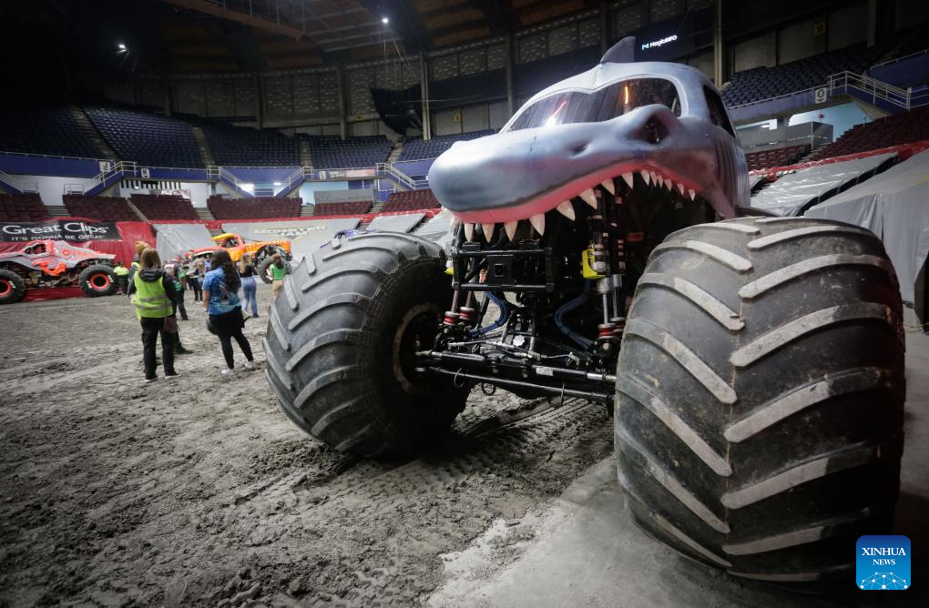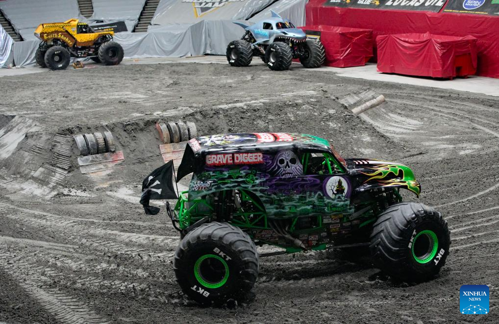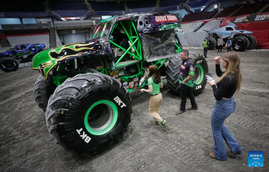 A monster truck is seen during a media preview of Monster Jam in Vancouver, British Columbia, Canada, on March 8, 2024. (Photo by Liang Sen/Xinhua)