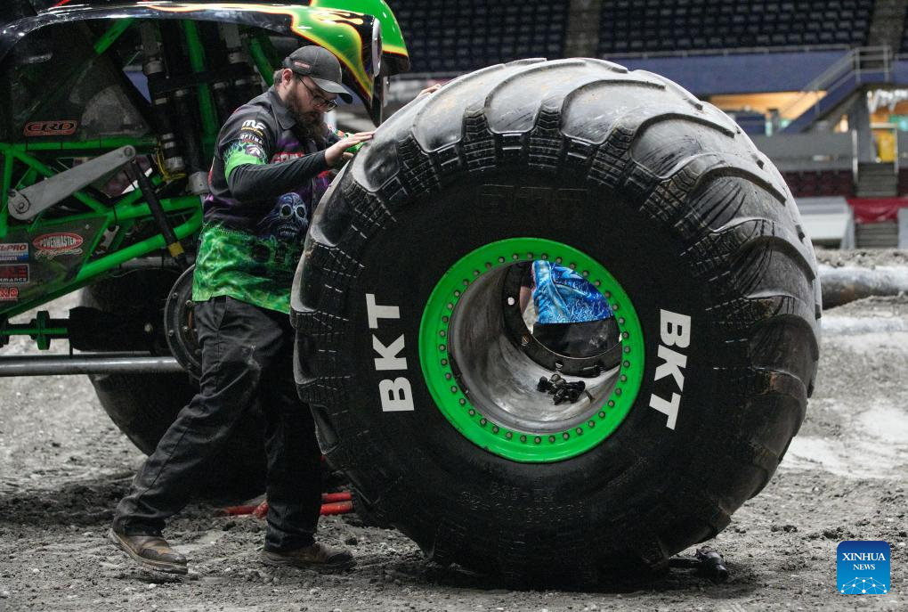A worker pushes a giant wheel during a media preview of Monster Jam in Vancouver, British Columbia, Canada, on March 8, 2024. (Photo by Liang Sen/Xinhua)