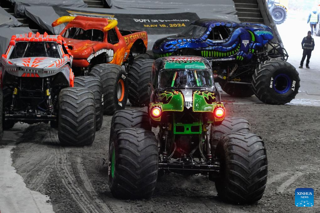 Monster trucks are seen during a media preview of Monster Jam in Vancouver, British Columbia, Canada, on March 8, 2024. (Photo by Liang Sen/Xinhua)
