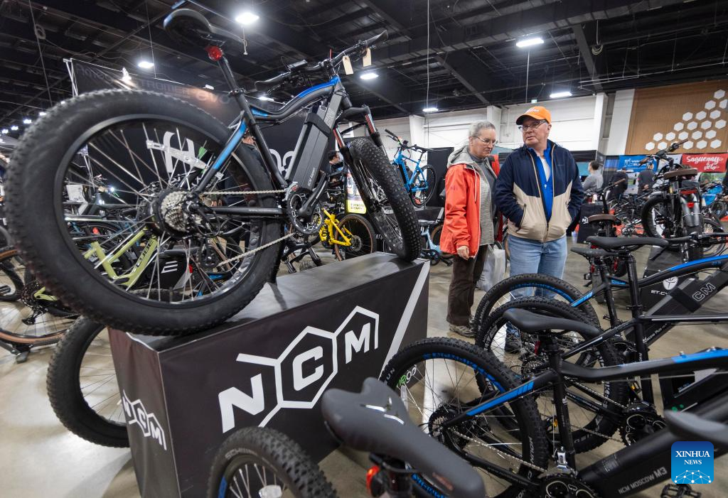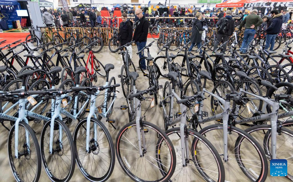 People visit the 2024 Toronto Bicycle Show and E-Bike Expo in Mississauga, the Greater Toronto Area, Canada, March 10, 2024. This annual event was held here from March 8 to 10, showcasing the latest products of more than 170 exhibitors. (Photo by Zou Zheng/Xinhua)