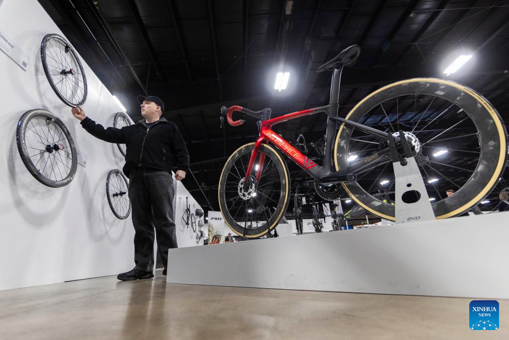 A man checks a wheel rim during the 2024 Toronto Bicycle Show and E-Bike Expo in Mississauga, the Greater Toronto Area, Canada, March 10, 2024. This annual event was held here from March 8 to 10, showcasing the latest products of more than 170 exhibitors. (Photo by Zou Zheng/Xinhua)