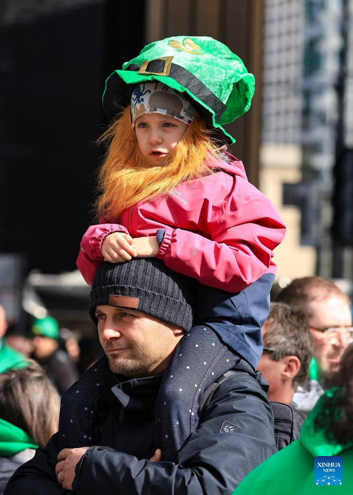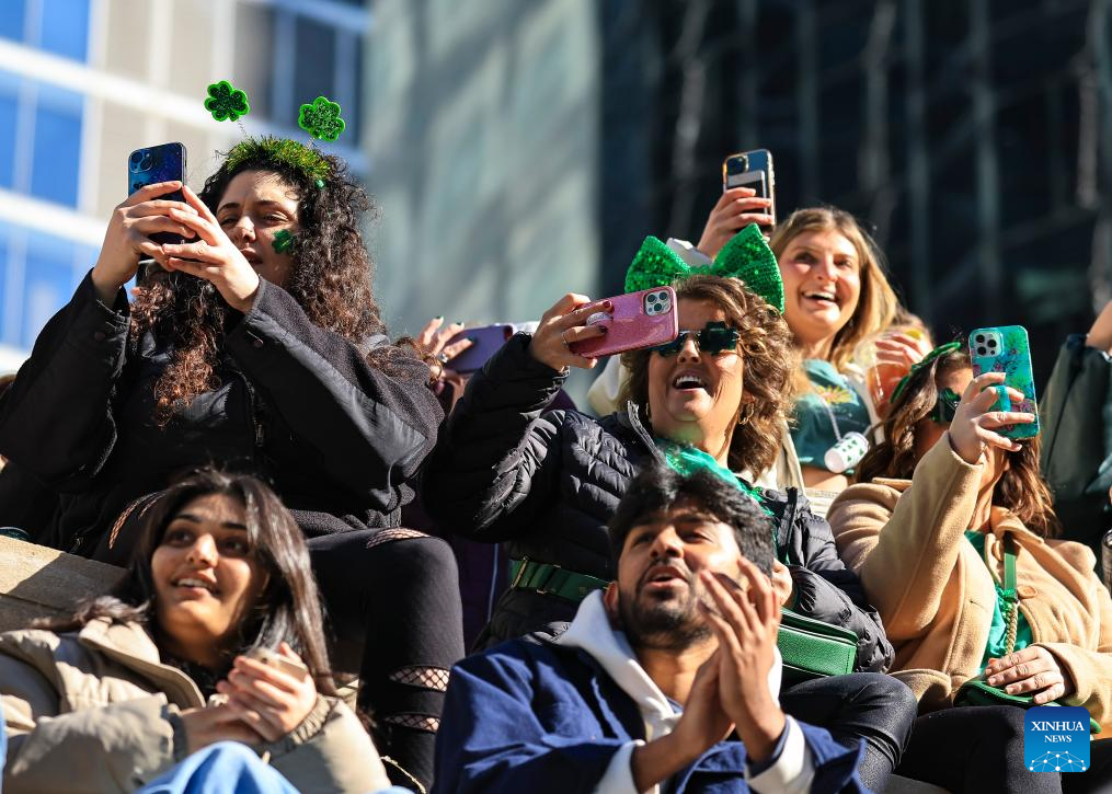 People attend an event in celebration of St. Patrick's Day in Chicago, the United States, March 16, 2024. (Photo by Joel Lerner/Xinhua)