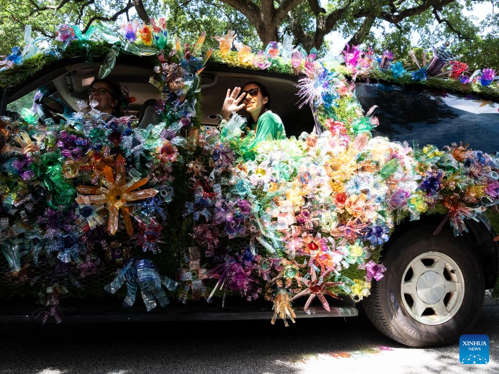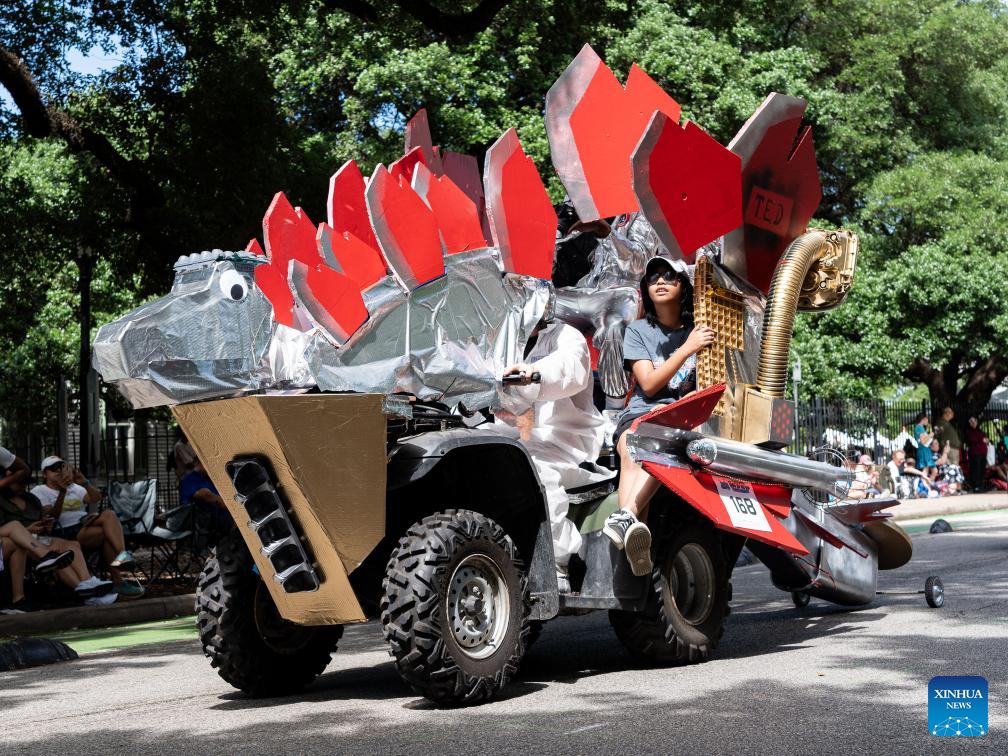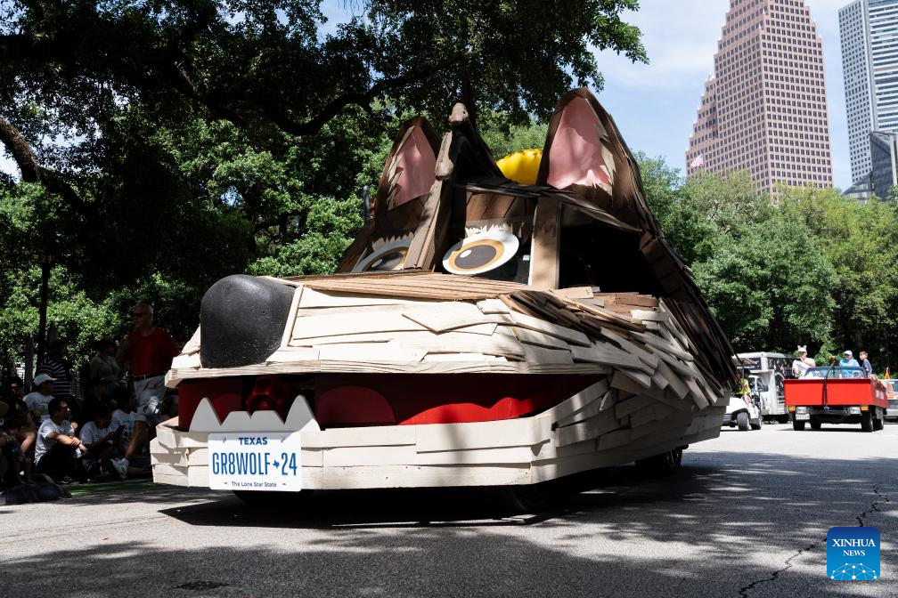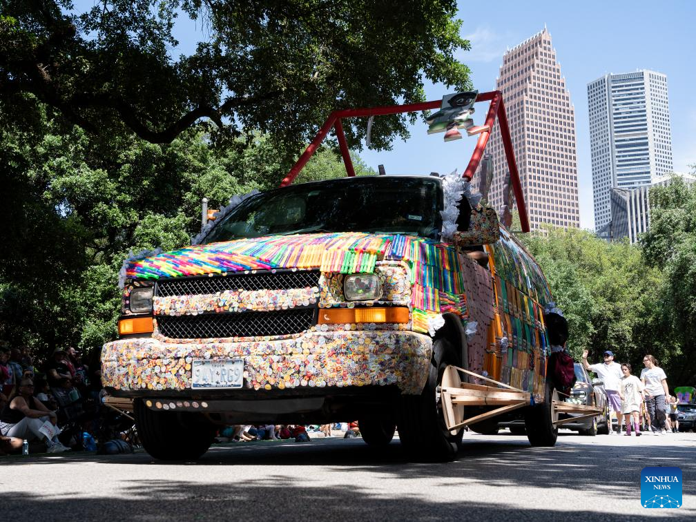A decorated vehicle participates in the 37th Houston Art Car Parade in Houston, Texas, the United States, April 13, 2023. The annual event attracted over 250 vehicles and entries from 23 states, drawing in more than 250,000 spectators. (Photo by Chen Chen/Xinhua)