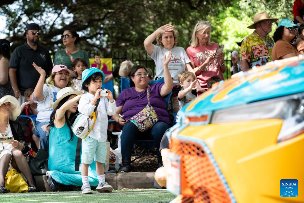 People watch the 37th Houston Art Car Parade in Houston, Texas, the United States, April 13, 2023. The annual event attracted over 250 vehicles and entries from 23 states, drawing in more than 250,000 spectators. (Photo by Chen Chen/Xinhua)
