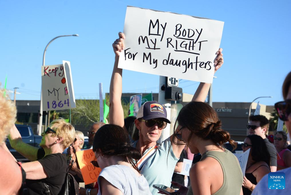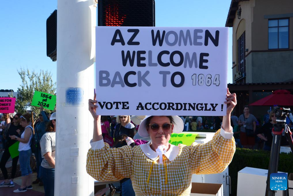 PHOENIX, the United States, April 14 (Xinhua) -- Hundreds of people took to the streets on Sunday in downtown Scottsdale in Arizona after the western U.S. state's Supreme Court reinstated a near-total abortion ban from 1864 on Tuesday.
