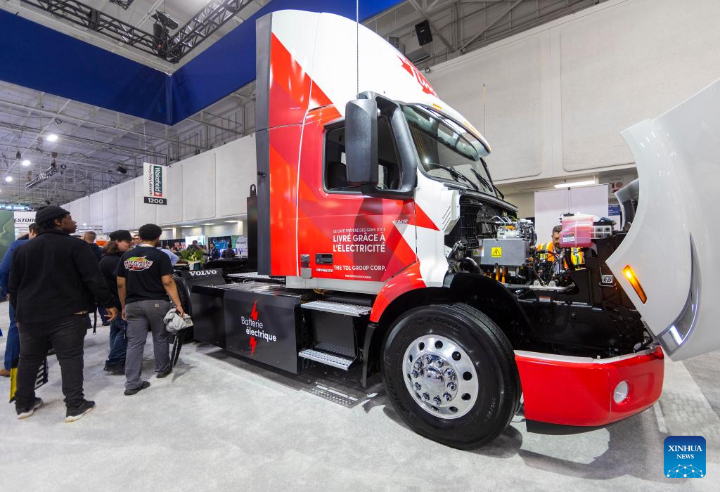 People look at a Volvo VNR 300 electric 6×4 tractor during the 2024 Truck World trade show in Mississauga, the Greater Toronto Area, Canada, on April 18, 2024. Providing a diverse range of products and services, the annual trade show is held here from April 18 to 20 with over 350 exhibitors. (Photo by Zou Zheng/Xinhua)