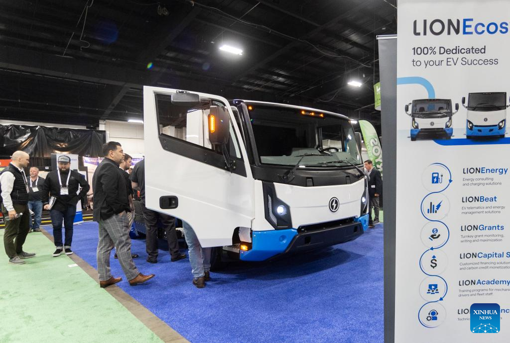 People look at a Lion 5 electric truck during the 2024 Truck World trade show in Mississauga, the Greater Toronto Area, Canada, on April 18, 2024. Providing a diverse range of products and services, the annual trade show is held here from April 18 to 20 with over 350 exhibitors. (Photo by Zou Zheng/Xinhua)