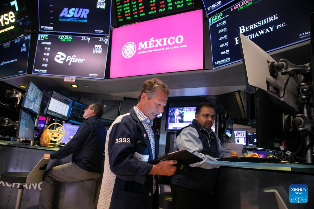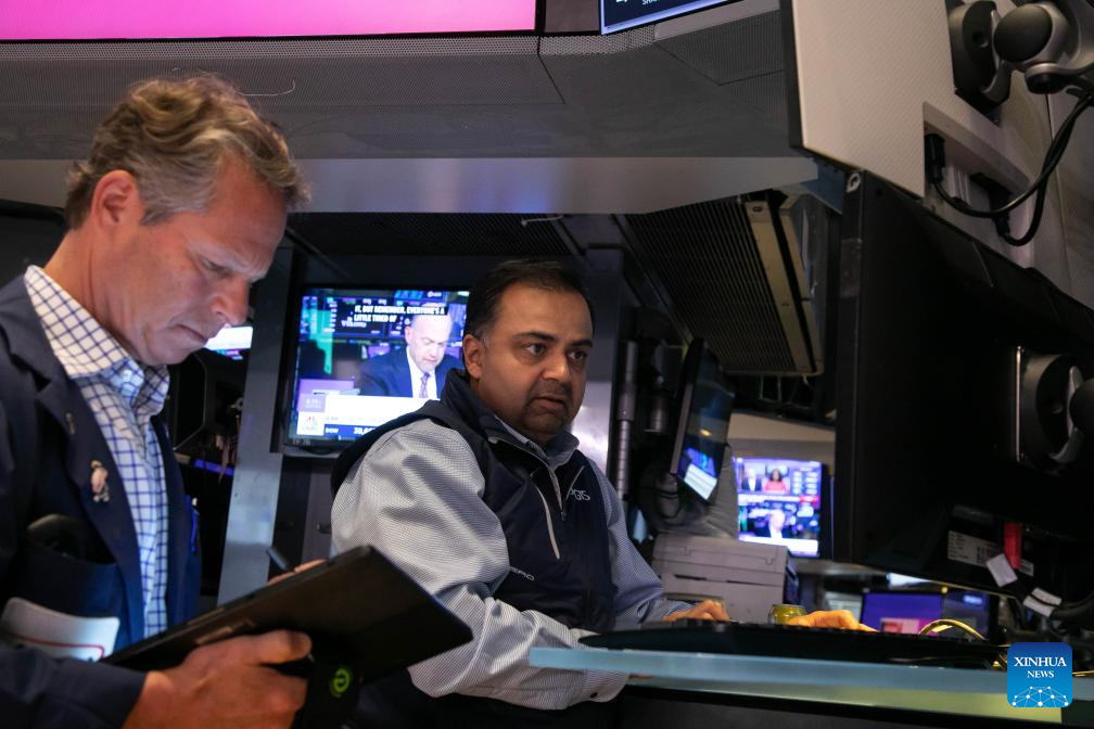 Traders work on the floor of the New York Stock Exchange (NYSE) in New York, the United States, on May 3, 2024. U.S. stocks ended higher on Friday. The Dow Jones Industrial Average rose 450.02 points, or 1.18 percent, to 38,675.68. The S&P 500 added 63.59 points, or 1.26 percent, to 5,127.79. The Nasdaq Composite Index increased by 315.37 points, or 1.99 percent, to 16,156.33. (Photo by Michael Nagle/Xinhua)