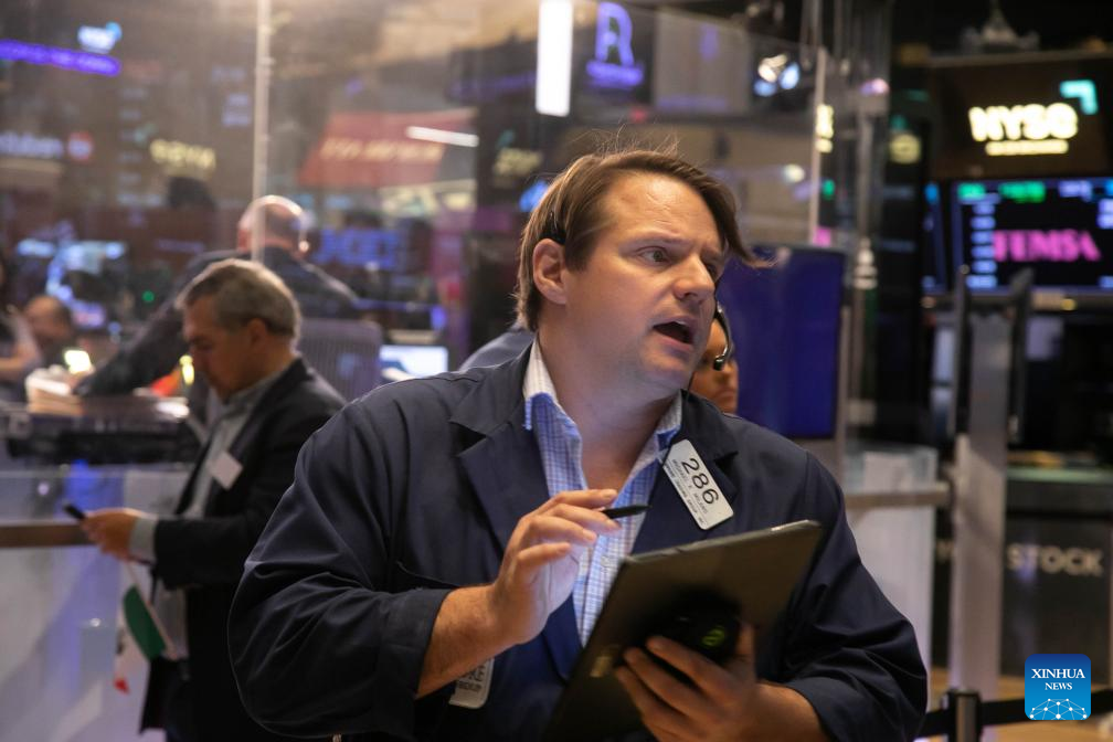 A trader works on the floor of the New York Stock Exchange in New York, the United States, on May 3, 2024. U.S. stocks ended higher on Friday. The Dow Jones Industrial Average rose 450.02 points, or 1.18 percent, to 38,675.68. The S&P 500 added 63.59 points, or 1.26 percent, to 5,127.79. The Nasdaq Composite Index increased by 315.37 points, or 1.99 percent, to 16,156.33. (Photo by Michael Nagle/Xinhua)