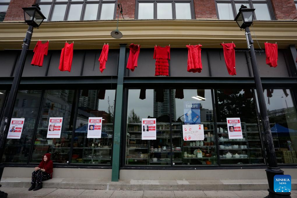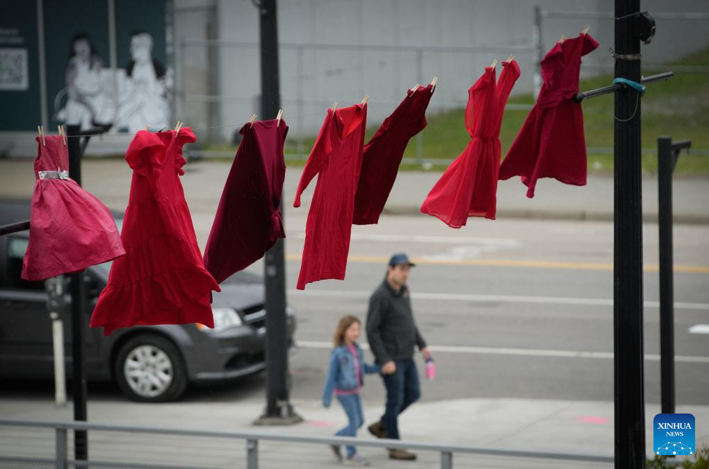 Red dresses are hung along a street to mark the National Day of Awareness for Missing and Murdered Indigenous Women and Girls in New Westminster, British Columbia, Canada, on May 5, 2024. May 5 is the National Day of Awareness for Missing and Murdered Indigenous Women and Girls, also known as Red Dress Day, in Canada. (Photo by Liang Sen/Xinhua)