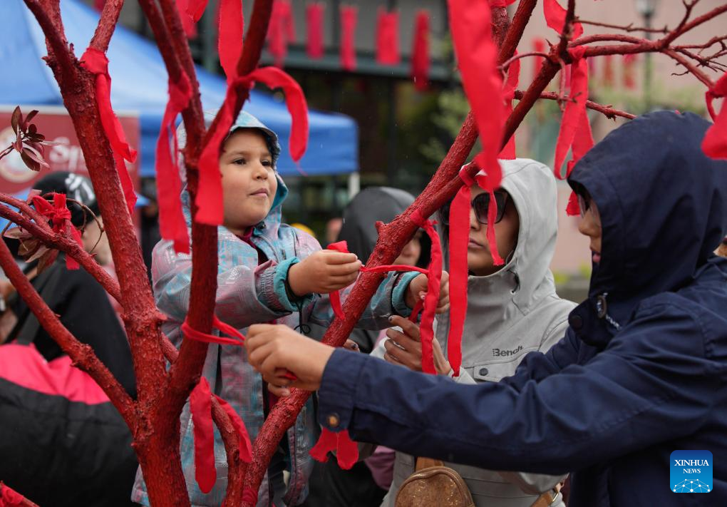 People tied red ribbons on a tree during the Red Dress Day ceremony in New Westminster, British Columbia, Canada, on May 5, 2024. May 5 is the National Day of Awareness for Missing and Murdered Indigenous Women and Girls, also known as Red Dress Day, in Canada. (Photo by Liang Sen/Xinhua)
