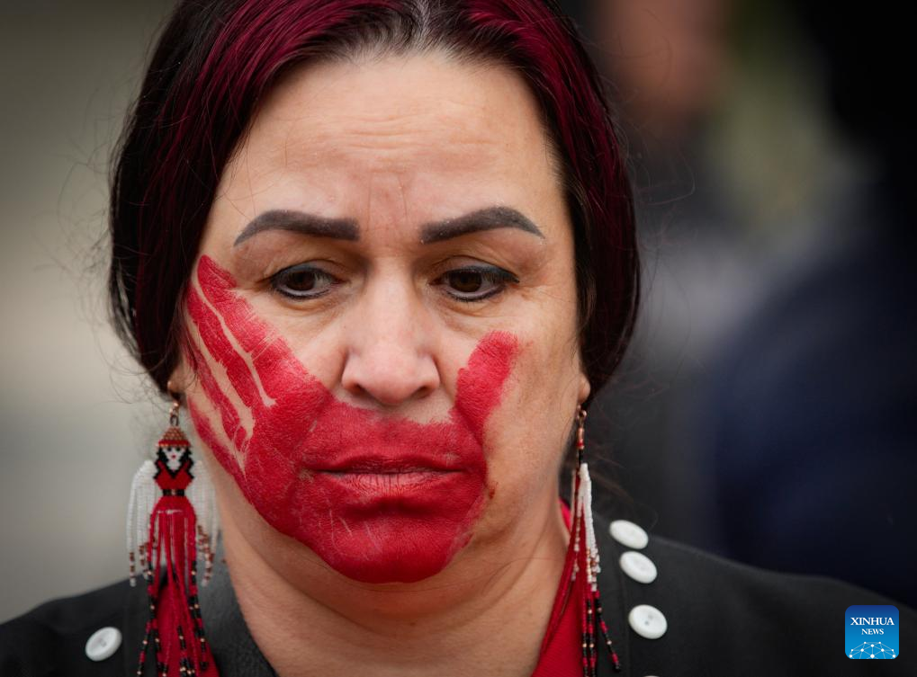 An indigenous woman bearing hand-shaped paint mark over her mouth is seen during the Red Dress Day ceremony in New Westminster, British Columbia, Canada, on May 5, 2024. May 5 is the National Day of Awareness for Missing and Murdered Indigenous Women and Girls, also known as Red Dress Day, in Canada. (Photo by Liang Sen/Xinhua)